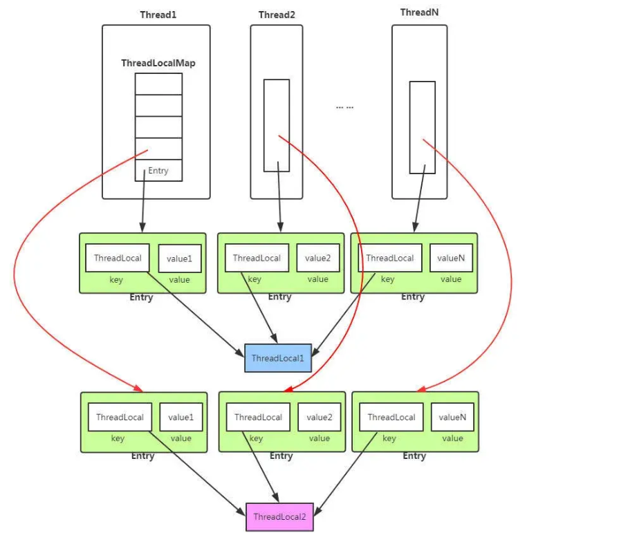Thread类中,有个ThreadLocal.ThreadLocalMap的成员变量。ThreadLocalMap内部维护了Entry数组,每个Entry代表一个完整的对象,key是ThreadLocal本身,value是ThreadLocal的泛型对象值。