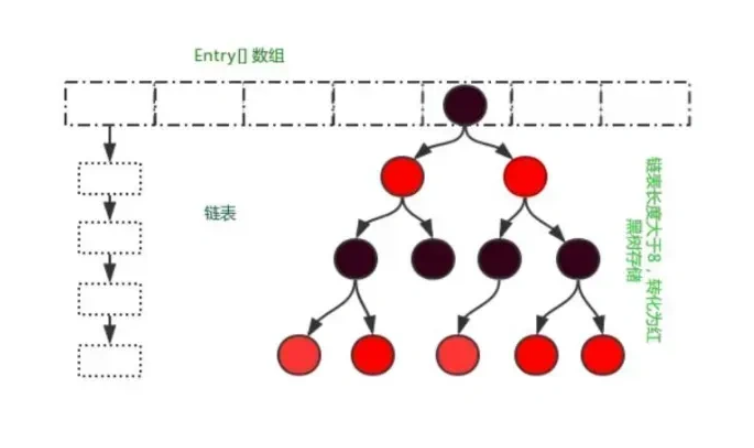 - 所以在 JDK 1.8 版本的时候做了优化:当一个链表的长度超过 8 时,就转换数据结构,不再使用链表存储,而是使用红黑树。查找时使用红黑树,时间复杂度 O (log n),可以提高查询性能;但是在数量较少时(数量小于 6),会将红黑树转换回链表。